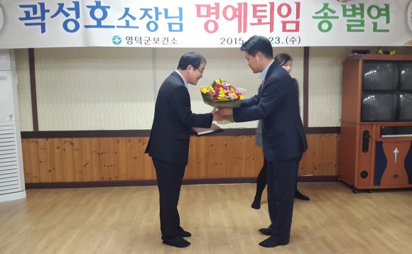 |  | | | ⓒ (주)영남도민일보 | | [영남도민일보] 홍인환 기자 = 영덕군 보건소는 연말 명예퇴임을 앞두고 있는 곽성호 소장의 명예퇴임식 및 송별연이 지난 23일 이희진 영덕군수를 비롯한 일백여 동료 공직자가 자리한 가운데 조촐히 치러졌다.