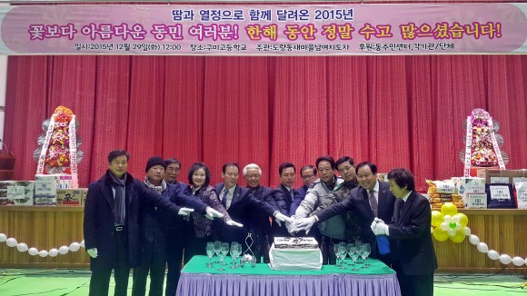 이날 행사는 도량동 새마을남여지도자(협의회장 이광용, 부녀회장 차선희) 공동 주관으로 다사다난했던 2015년 을미년 한 해를 총 결산하고, 동 발전을 위해 헌신한 분들의 노고를 격려하고 희망찬 새해를 맞이하기 위해 마련되었다.
