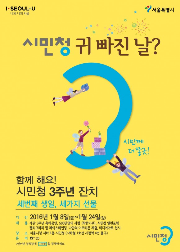 서울시는 시민청 개관 3주년을 맞아 「함께해요! 시민청 3주년 잔치」를 8일(금)~24일(일) 시민청 곳곳에서 개최, 다양한 프로그램으로 시민들을 맞는다고 밝혔다.