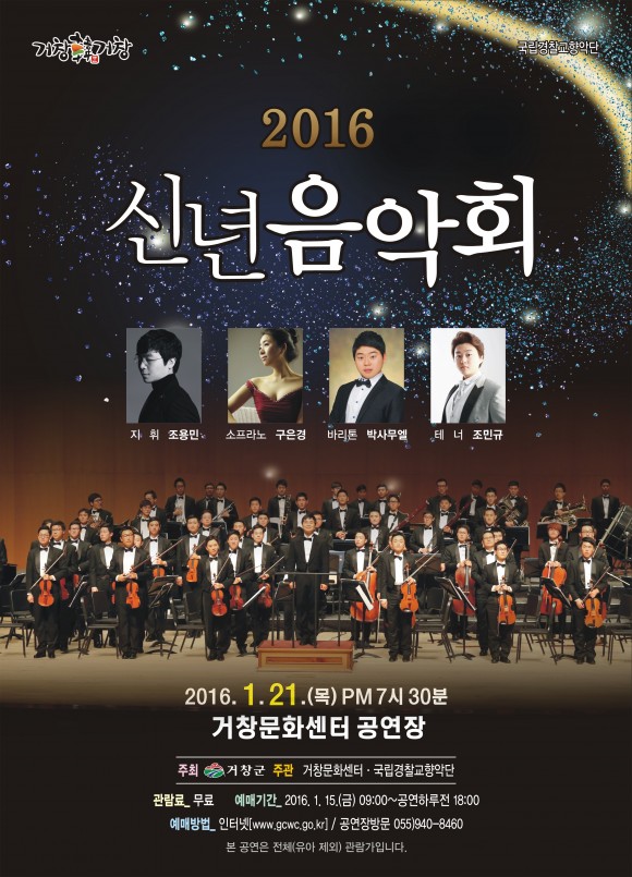 1월 21일(목) 19시30분에 개최되는 ‘2016 신년음악회’는 국가행사와 경찰행사에 참여하기 위해 창단한 국립경찰교향악단을 초청하여 많은 군민들과 방학을 맞은 청소년들을 위해 다함께 즐길 수 있는 프로그램으로 준비하였다.