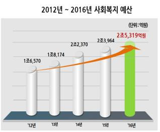 이러한 재정건전성을 바탕으로 올해 역대 최대인 2조 5,316억원의 사회복지예산을 편성하여 그동안 복지혜택이 미치지 못했던 곳과 계층을 찾아 지원하는 다양한 서민복지 시책을 시행한다.