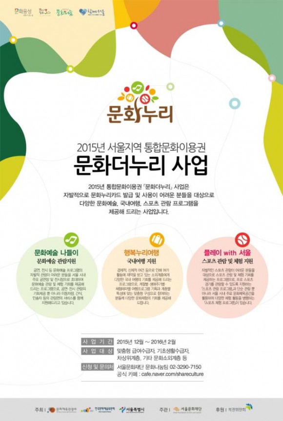 서울시와 서울문화재단은 거동이 불편해서, 자격 조건에 못미쳐서 등을 이유로 '15년에 문화누리카드(통합문화이용권)를 발급받지 못한 서울 거주 맞춤형 급여수급자, 기초생활수급자, 차상위계층, 장애인, 고령자 등 문화소외시민 약 2만 명을 선정, 혜택을 제공한다고 밝혔다. 신청 가능한 프로그램은 ①공연관람 지원 프로그램 <문화예술 나들이>