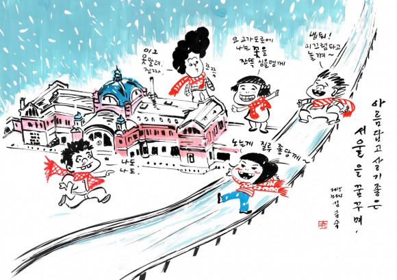 한편 전시 오프닝 행사는 1월18일 오전 10시 30분부터 시청 본관 로비에서 열리며 박원순 서울시장과 박재동 화백 등이 참여할 예정이다. 오프닝 행사는 서울시장과 만화가들이 다함께 그리는 서울역일대의 이야기, 서울시민의 소망을 담은 종이비행기 날리기, 박재동화백의 즉석 연주 등이 진행될 예정이다.