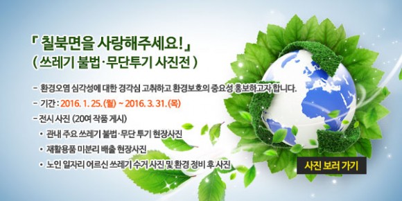 면은 오는 3월말까지 칠북면 홈페이지(www.haman.go.kr/town/Chilbuk)에 ‘쓰레기 불법·무단투기 사진전’을 온라인으로 개최한다고 밝혔다. ‘칠북면을 아껴주세요’라는 주제로 개최되는 이번 사진전에는 관내 쓰레기 무단투기 현장사진, 재활용품 미분리 배출 사진, 대형폐기물 및 영농폐기물 불법 투기 사진, 불법 쓰레기 수거·정비 사진 등 30여 점의 현장사진을 게시함으로써 주민들에게 쓰레기 무단투기의 심각성을 일깨울 수 있도록 했다.