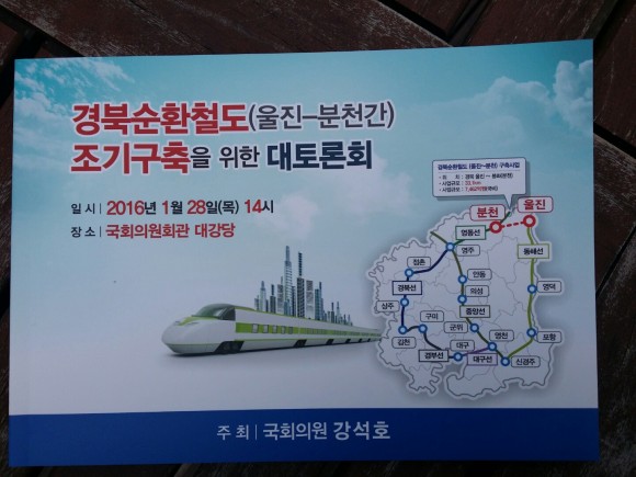 |  | | | ⓒ (주)영남도민일보 | | [영남도민일보] 남효원 기자 = 강석호 국회의원 주관으로『경북순환철도(울진~분천) 조기건설의 필요성 및 관광분야 시너지 효과』라는 주제로 1월 28일 14시 서울 여의도 국회의원회관 대강당에서 울진군민 및 재경군민들을 모시고 철도시설 및 관광분야 전문가, 정부관계자들이 심도 있는 토론회를 가졌다. 토론회에 앞서 일반인들의 이해를 돕고자 동영상을 시청하고 서울과학기술대 철도전문대학 김시곤 원장, 충북발전 연구원 공공분석센터 조남건 센터장, 한국관광연구원 관광산업연구실 김향자 실장이 주제발표를 했다.