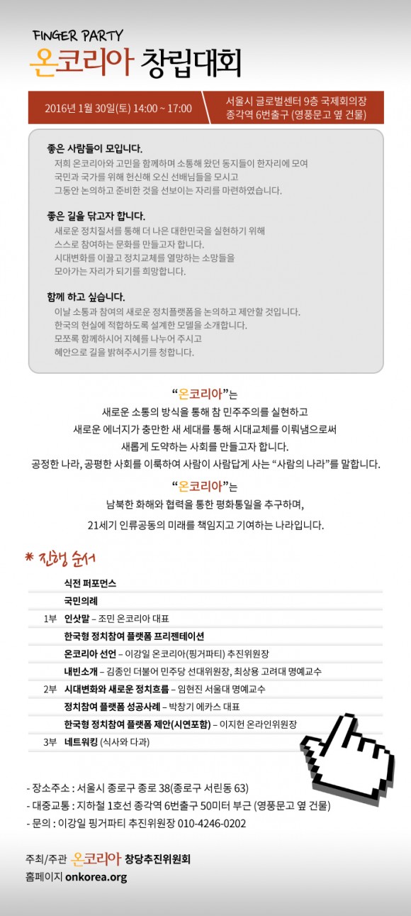 손가락은 주체성과 자율성, 참여의 상징으로 “온코리아”는 온라인과 모바일을 사용하는 손가락을 상징화하여 “핑거파티”라는 새로운 플랫폼을 이날 선보인다. 핑거파티는 새로운 문화·IT세대들에게 최적화 된 모바일을 중심으로 하는 플랫폼으로 한국 정치방식에 새로운 이정표를 세울 것으로 기대 된다.