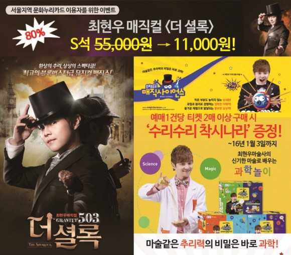 서울문화재단은 문화누리카드 이용자를 대상으로 최현우 매직컬(Magic과 Musical을 합친 콘서트) ‘더 셜록’의 80% 할인권을 비롯해 약 2천만 원 상당의 과학놀이 완구물품 500개를 제공했다. 이번 나눔은 공연기획사 ㈜클립서비스와 마술콘텐츠 전문회사인 ㈜라온플레이의 기부로 마련됐다. |  | | | ⓒ (주)영남도민일보 | | 과학놀이 ‘수리수리 착시나라’는 마술사 최현우가 직접 개발했으며, 초등학교 저학년 어린이를 대상으로 과학을 신기한 마술로 배우는 완구 물품이다.