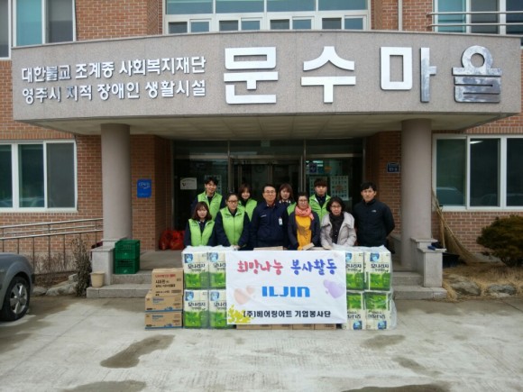 |  | | | ⓒ (주)영남도민일보 | | [영남도민일보] 김창기 기자 = 영주시 장수면 반구리에 위치한 ㈜베어링아트(대표 : 박형만)에서는 지난 1월 29일 민족 최대명절인 설날을 맞이하여 지역내 장애인복지시설인 문수마을을 찾아 봉사활동을 펼치고 위문물품을 전달하였다.