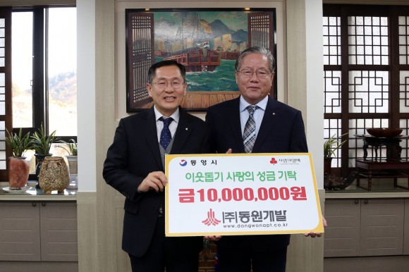 이에 김동진 통영시장은 설 명절을 맞아 성금 기탁으로 이웃사랑을 전하는 동원개발에 감사의 말을 전하고, 앞으로도 지역을 대표하는 기업으로써 지역 사랑 마음을 솔선수범해 줄 것을 당부했다.