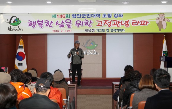|  | | | ⓒ (주)영남도민일보 | | [영남도민일보] 김진규 기자 = 함안군(군수 차정섭)은 지난 3일 오후 2시 30분, 군청 3층 회의실에서 주민, 공무원 등 200여 명이 참석한 가운데 개그맨 겸 연극기획자 전유성 씨를 초청해 ‘행복한 삶을 위한 고정관념 타파’라는 주제로 제146회 함안군민대학 강좌를 개최했다.