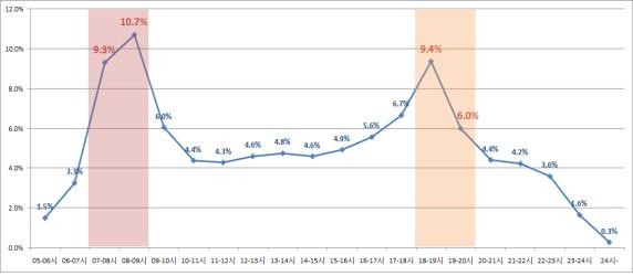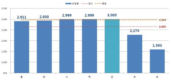 요일별 : 금요일이 일 평균 300만 명(평일 대비 101.2%)으로 가장 많았고, 평일 중에는 월요일이 291만 명으로 다른 요일에 비해 상대적으로 적었다. 특히, 일요일과 공휴일은 평일 평균치의 절반 수준(53.7%)인 159만 명에 그쳤다. 시간대별 : 출‧퇴근시간대인 오전 7시~9시, 오후 18시~20시가 전체 이용객의 1/3 이상(34.4%)을 차지했고, 심야 시간대인 24시 ~오전 1시까지(0.3%)가 이용객이 가장 적었다.