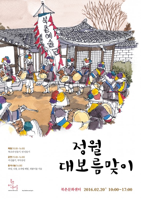 주요 행사로는 새해의 소원 성취를 기원하는 북촌 예술단의 신명나는 ‘지신밟기’ 공연과 한 해의 태평성대와 풍년을 기원하는 국악 공연이 연이어 펼쳐진다. 또, 온 가족이 함께 ‘복조리 만들기’와 ‘연 만들기’ 체험을 통해 붉은 원숭이의 해 병신년(丙申年)의 복덕과 소원을 빌어보는 시간이 마련된다. 이외에도, 북촌 주민들과 방문객이 정월대보름음식 나눔을 통해 화합을 다지고 한 해의 건강과 복을 기원하는 시간이 마련된다. 서울시 북촌문화센터(2133-1371~2) 또는 북촌한옥마을 홈페이지(http://bukchon.seoul.go.kr)를 통해 자세히 안내받을 수 있다.