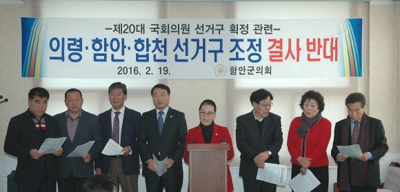 제20대 총선을 앞두고 함안군의회 의원들은 의령ㆍ함안ㆍ합천 선거구 통폐합 조정안에 대해 반대의 뜻을 밝히고, 기존 선거구 유지를 강력히 촉구했다.