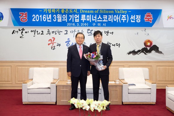 구미시는 Global 기업인 루미너스코리아(주)의 미래를 향한 진취적인 경영활동과 지속적인 기술개발을 통하여 지역 경제발전에 이바지한 공로를 높이 평가해「2016년 3월의 기업」으로 선정, 범시민 기업 사랑의 의미를 담아 시청사 국기게양대 및 시가지 군집 가로 게양대에 해당 회사기를 1개월간 게양한다.