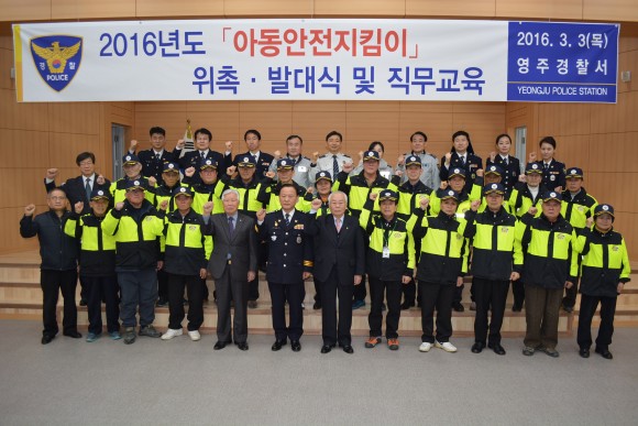 |  | | | ⓒ (주)영남도민일보 | | [영남도민일보] 김창기 기자 = 영주경찰서(서장 김국선)는 4층 대강당에서 ‘2016년 아동안전지킴이 위촉 및 발대식’을 개최했다. 이 날 발대식에는 경찰서장, 영주시 노인회장, 경우회장을 비롯한 아동안전지킴이 20명, 지구대장 등 40여명이 참석했다.