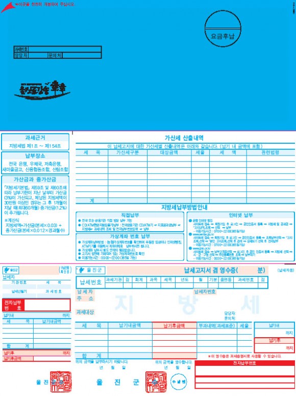 많은 납세자들이 지방세 고지서를 확인하지 않고 방치하는 사례가 빈번하고, 울진군 인구중 65세이상 노인인구 비율이 31%로, 초고령 사회로 접어드는 만큼 고지서 색상을 넣음으로써 식별이 용이하도록 했다. 납세고지서 정기분, 수시분으로 처음 부과되는 고지서는 청색으로, 납부 고지 후 미납되었을 때 독촉고지서는 주황으로, 그 후에도 세금을 납부하지 않았을 때의 체납고지서는 빨강으로 납부 독려하게 된다.