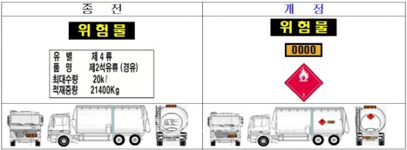 현행 위험물안전관리법상 이동탱크저장소의 후면에 해당 위험물의 품명, 주의사항 등을 기재하도록 하고 있으나, 동법 시행규칙 및 고시 등이 개정되어 올해 1월 22일 공포됨에 따라, 위험물 이동탱크저장소의 전면 및 후면에는 위험물 표지를 부착하고, 후면 및 양측면에는 경고표지를 부착하여야 한다. 관계인은 위험물 표지 및 경고표지 등을 개정법령에 따라 기존 이동탱크저장소의 경우 2016년 12월 31일까지 개정기준에 맞춰 교체해야 하고, 신규 이동탱크저장소는 설치허가 및 완공검사 시 개정기준에 따라 부착해야 한다.