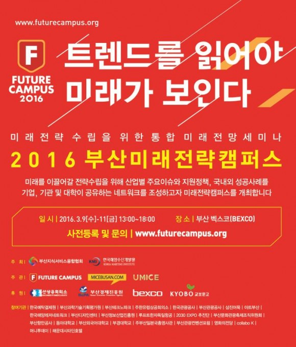 |  | | | ⓒ (주)영남도민일보 | | [영남도민일보] 최교열 기자 = 부산지식서비스융합협회(회장 구정회)와 한국해양수산개발원(원장 김성귀)이 공동주최 하는 ‘제2회 부산미래전략캠퍼스’가 3월 9일에서 3월 11일까지 3일간 부산 BEXCO 제1전시관에서 개최된다.