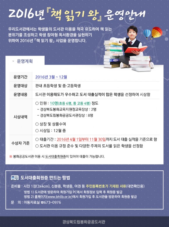 이 행사는 봉화 관내 초등학생 및 중 · 고등학생을 대상으로 2016년 4월 1일부터 11월 30일까지 봉화공공도서관 도서대출실적이 우수하고 도서관 이용규정을 잘 지킨 학생 10명을 선정하여 봉화교육지원청교육장상과 봉화공공도서관장상을 오는 12월에 시상할 예정이다.(문의 054-673-0976) 학생들이 책과 친해지는 계기를 마련하고자 봉화공공도서관에서는 연중 다채로운 독서관련 행사를 진행하고 있으며 특히 도서관 주간이 있는 4월과 독서의 달인 9월에는 풍성한 프로그램을 실시할 예정이다.