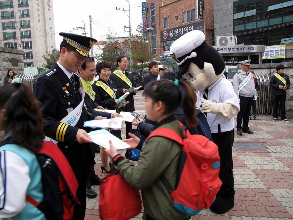 이날 캠페인에서는 학생들을 상대로 교통안전수칙 홍보물 노트를 배부하고, 포돌이 포순이 캐릭터를 활용해 무단횡단 하지 않기ㆍ길 건널 때는 차를 보고 걷기 등 안전보행 등을 지도했다.