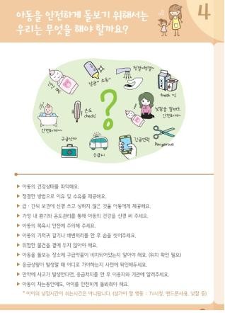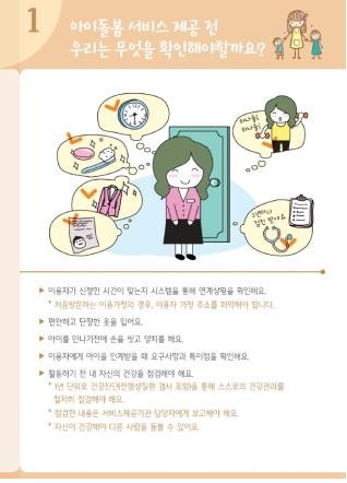 약 20페이지로 구성된 책자는 아이돌보미 서비스 범위부터 준수사항, 아동학대 신고요령 등을 이해하기 쉽게 그림으로 표현한 것이 특징이다.