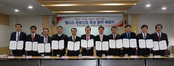 |  | | | ⓒ (주)영남도민일보 | | [영남도민일보] 오흥조 기자 = 중산층을 위한 의료, 건강 서비스, 항노화 제품, 체류형 관광을 융합한 미래지향적 웰니스 관광산업을 육성하기 위해 경상남도· 합천군· 산청군· 함양군· 거창군· 부산대학교 한방병원· 대한한의사협회 경남지부· 대한한약협회 경남지부· 대한약사회 경남지부·한국관광공사 경남지사·경상남도 관광협회(이하 “협약기관”이라 한다)는 3월 16일 경남도청 도정회의실에서 지리산 권역을 활용한 한방특화 웰니스 관광산업 육성과 발전을 위한 협약을 체결했다.