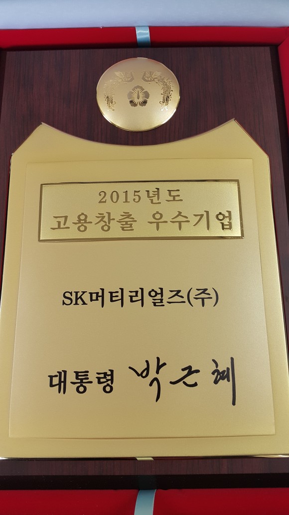 SK머티리얼즈 임민규 사장은 지난 17일 오전 청와대 영빈관에서 열린 ‘2015 고용창출 100대 우수기업’ 오찬에서 박근혜 대통령으로부터 인증패를 수여받았다.