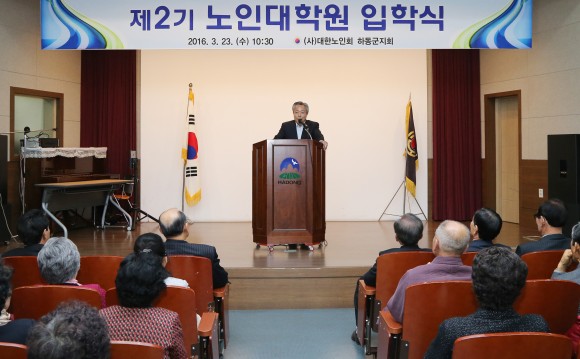 노인대학원 입학식은 국민의례, 노인강령 낭독, 경과보고, 개강사, 축사 순으로 진행됐다.