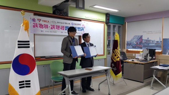 |  | | | ⓒ (주)영남도민일보 | | [영남도민일보] 권기한 기자 = 영광고등학교(교장 최준식)와 영주 YMCA 희망 지역아동센터 및 한국 청소년 멘토스쿨은 2016년 3월 22일 ‘교육재능기부•교육지원사업’ 업무협약식을 거행하였다. 담당교사 전재형 교사의 사회로 시작된 이 날 협약식에는 영주 YMCA 희망 지역아동센터 측에서 안은수 센터장이, 한국 청소년 멘토스쿨 측에서 김주원 대표가 참석하였으며, 영광고등학교 측에서는 최준식 교장과 임하규 교감을 비롯하여 업무 담당 박영수 부장 외 보직교사 다수가 참석하였으며, 멘토 학생 20여 명이 자리를 같이하여 시종일관 진지한 분위기 속에서 진행되었다. 이 날 협약식은 영광고등학교와 영주 YMCA 희망 지역아동센터 및 한국 청소년 멘토스쿨이 상호 협력하여 영주시 관내 소외계층 중학생들을 대상으로 교육 재능기부 활동을 전개하는 사업에 대해 적극적인 지원을 약속하는 뜻 깊은 행사였다.