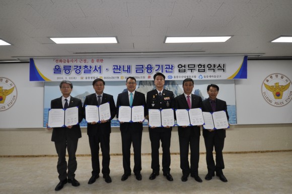 |  | | | ⓒ (주)영남도민일보 | | [영남도민일보] 홍인환 기자 = 울릉경찰서(서장 김해출)에서는 3. 22(화). 울릉농협은행·농업협동조함·우체국·수협·새마을금고 등 6개 기관과 함께 『‘전화금융사기 근절을 위한 유관기관 MOU』를 체결하였다. 이번 협약식에서 울릉도내 금융기관에서는 금융사기(보이스 피싱, 파밍, 스미싱 등) 발생시 즉시 경찰서에 신고하여 범인검거에 협조하는 한편, 금융기관에 근무 중인 청원경찰 등을 통하여 어르신들 및 주부 등이 현금자동인출기 송금 시도시 반드시 확인토록 하는 등 범죄예방에 힘쓰기로 힘을 모았다.
