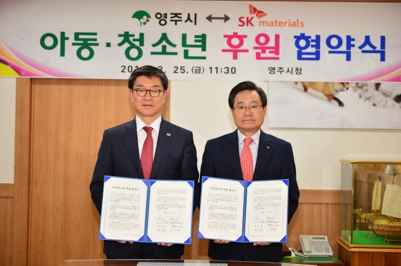 SK머티리얼즈㈜는 지난 3월 25일 영주시청을 방문, 지난 2011년 9월부터 매달 소년소녀가장에게 지원 중이였던 후원금을 정기후원하기 위해 이번 협약식을 가졌다고 밝혔다.