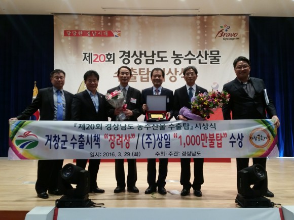 |  | | | ⓒ (주)영남도민일보 | | [영남도민일보] 김병한 기자 = 거창군(군수권한대행 안상용)은 지난 29일 경상남도청 4층 대회의실에서 개최한 제20회 경상남도 농수산물 수출탑 시상식에서 수출시책 우수 시․군 평가결과 장려상 수상과 함께 ㈜상일에서도 1천만불 수출탑을 수상했다.