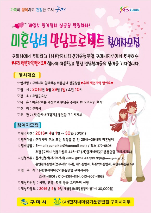구미시에 주소를 두고 있거나, 직장을 두고 있는 만 25세부터 39세까지 미혼남녀 누구나 참여가 가능하다. 행사 참여를 희망하는 미혼남녀는 모집기간인 4월 1일부터 4월 30일까지 구미시청 홈페이지 새소식 (1993번)란을 검색하여 신청서식을 다운받아 E-mail 또는 팩스로 한자녀더갖기 운동연합 구미지부로 신청하면 된다.