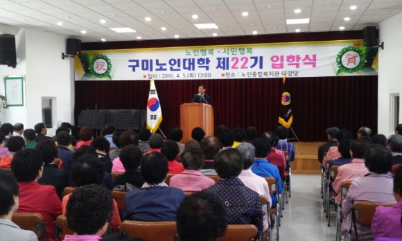 |  | | | ⓒ (주)영남도민일보 | | [영남도민일보] 안충도 기자 = (사)대한노인회구미시지회(지회장 박두호) 부설 노인대학(학장 노수천)은 2016년도 제22기 노인대학 입학식을 4. 5.(화) 13:00에 노인종합복지관 3층 대강당에서 수강생과 내빈 등 260여 명이 참석한 가운데 개최하였다.