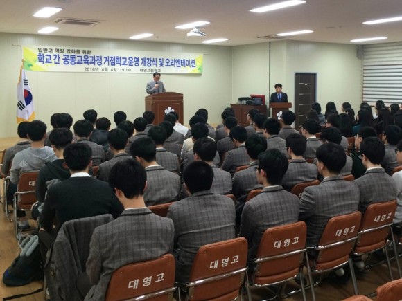 |  | | | ⓒ (주)영남도민일보 | | [영남도민일보] 김창기 기자 = 대영고등학교(교장 이지흠)는 경상북도 교육청 지정 학교 간 공동교육과정 거점학교로 지정되어 일반고 교육역량강화 프로그램으로 2016년 4월 4일(월) 19시에 공동교육과정 거점학교 개강식 및 오리엔테이션을 실시하였다.