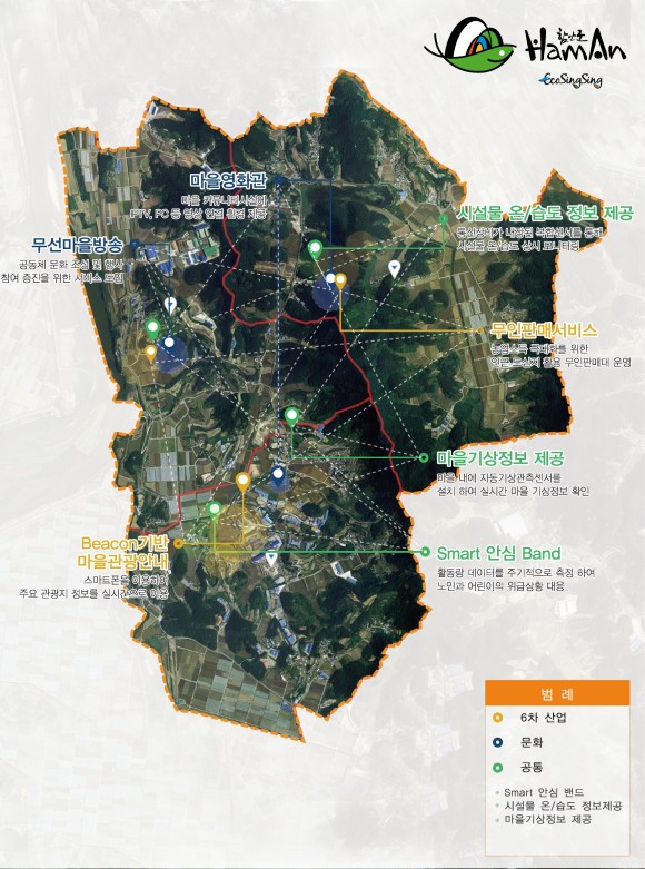 이에 따라 군은 국비 등 6억 4,000여만 원의 사업비를 확보해 기본 ICT 인프라를 구축하고 이를 기반으로 마을기상정보시스템·무인판매대 설치·운영으로 관광객 유입과 마을 생산품의 판매확산을 도모하며, 무선마을방송시스템과 마을영화관 설치·운영과 스마트 안심밴드 보급 등으로 마을공동체 문화 활성화와 주민의 행복한 생활을 지원할 계획이다.