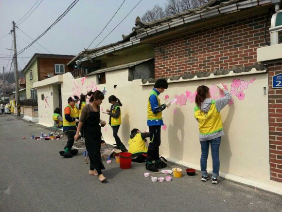 영주시 가흥동 도립도서관 일대 골목길 11가구 200M 구간을 ‘책과 꽃’이라는 주제로 모두모아봉사단, 새누리청년봉사단, 대학생자원봉사자 등 60여명의 자원봉사자들이 참여하여 담장 벽화그리기에 구슬땀을 흘렸다.