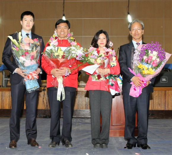 ‘3선같은 초선’최교일 후보(우측 장욱현영주시장, 이현준예천군수와 부인 이홍채여사 죄측 고윤환 문경시장등)가 제20대 총선 영주· 문경· 예천 선거구 국회의원 당선자로 확정됐다.