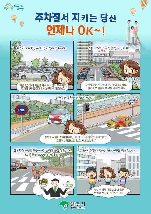 이를 위하여 『주차질서 지키는 당신, 언제나 OK~!』 『불법 주정차 더 이상은 NO!』라는 주제의 웹툰과 일반 홍보물 및 카드뉴스를 제작하여 영주시 홈페이지와 SNS에 배포하였다.