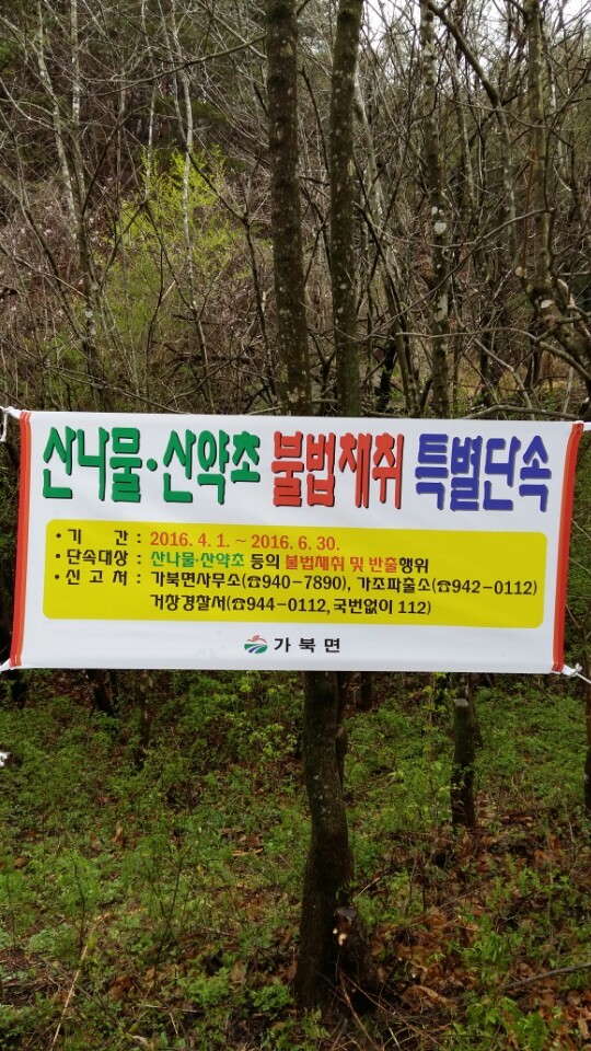 산림 내 산나물 및 산약초 등 임산물을 소유자 동의 없이 불법으로 채취하는 행위는 ‘산림자원의 조성 및 관리에 관한 법률’ 제73조에 의거 최고 7년 이하의 징역 또는 2,000만원이하의 벌금에 해당되는 범죄행위로 가북면에서는 무분별한 채취를 방지하고자 마을 및 등산로 입구 등에 불법채취 예방 현수막을 설치하고 이장회보나 마을 방송 등을 통해 홍보를 강화하고 있다. 아울러 지역주민의 피해 예방을 위하여 가조치안센터와 연계하여 집중단속도 시행 중이다.
