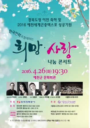 이번 음악회는 경북 도청 이전 축하 및 2016 예천세계곤충엑스포 성공기원을 기념하고자 예천군 시민들의 많은 관심으로 다가올 것이라 전망된다. 예천군 시민의 문화향유를 위해 기획된 이번 음악회는 대중의 귀에 익숙한 클래식, 팝송, 재즈 등의 다양한 장르를 팝·클래식으로 재해석하여 남녀노소를 불문하고 누구나 쉽게 즐길 수 있는 레퍼토리로 준비되며, 소프라노 성혜진 ,테너 김철호, 팝페라 가수 한아름, 뮤지컬 가수 오정환 등이 출연해‘희망ㆍ사랑 나눔 콘서트’의 열기를 더해줄 전망이다.