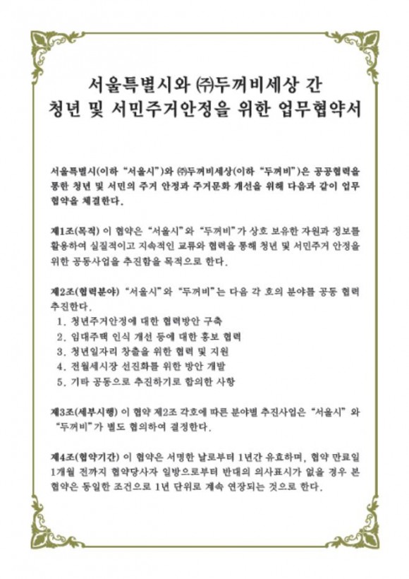 |  | | | ⓒ (주)영남도민일보 | | [영남도민일보] 이남희 기자 = 청년주거빈곤률이 22.8%에 육박한 가운데 서울시가 청년 및 서민주거 안정을 위해 ㈜두꺼비세상과 손을 잡았다. 이를 위해 4월26일(화) 업무협약식을 체결한다고 밝혔다. 이번 업무협약은 서울시에 거주하는 청년과 서민들의 열악한 주거환경을 개선하기 위해 민간임대주택에 대한 정보를 유기적으로 연계할 수 있도록 민관이 협업체계를 갖추는 데에 그 목적이 있다. 업무협약에 따라, 서울시와 ㈜두꺼비세상은 임대차 시장의 정보 및 정책을 공유하고 임차인 보호를 위한 제도 및 정책을 홍보한다. 그리고 청년 주택임대사업자 및 부동산 홍보 업체의 안정적인 창업을 위한 멘토링을 지원한다.