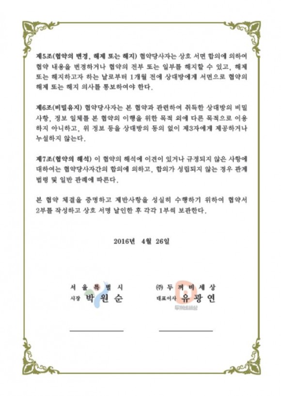 박원순 시장은 “청년 및 서민의 주거빈곤을 해소하고 안정적인 주거를 향유하기 위해서는 청년기업의 참신한 생각과 정보공유 등의 협력이 필요하다”라며 “이번 업무협약 체결이 청년과 서민의 주거안정에 기여하고 청년기업들의 안정적인 성장에 밑거름이 되길 기대한다”라고 말했다.