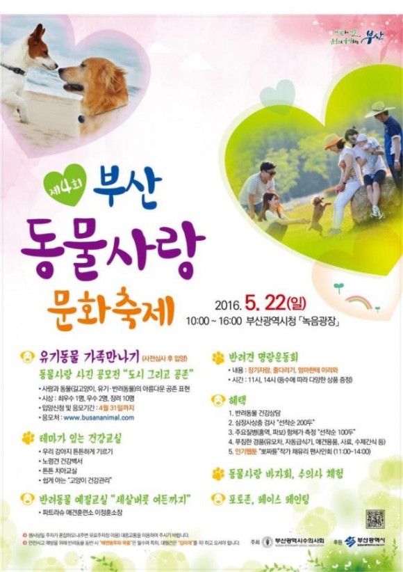 부산시 관계자는 “이번 축제를 통해 시민과 동물이 더불어 사는 생명존중의 사회를 구현하고, 성숙된 반려동물 문화가 완전 정착되기를 기대한다”고 전했다.