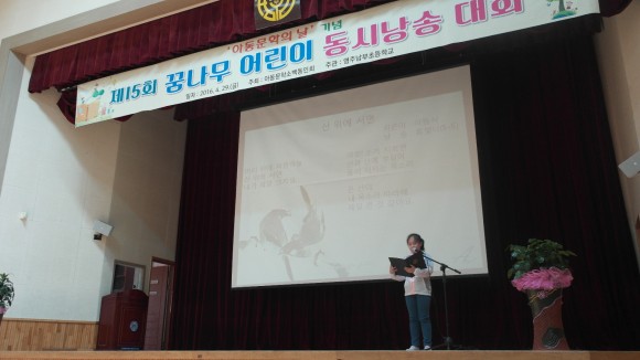 |  | | | ⓒ (주)영남도민일보 | | [영남도민일보] 권기한 기자 = 영주남부초등학교(교장 김치묵)는 4월 29일 아동문학의 날을 맞아 제 15회 꿈나무 어린이 동시낭송 대회를 개최하였다. 아동문학소백동인회의 주최로 열다섯 번째를 맞는 꿈나무 어린이 동시낭송 대회에는 5학년 22명의 학생들이 작가의 시를 낭송하는 기회를 가졌다. 1학년 권예은 학생의 색소폰 연주와 6학년 임우일 학생 외 7인으로 구성된 꿈의 오케스트라의 식전 공연으로 시작되어 아동문학의 날 선언문 낭독, 낭송요령 안내, 낭송대회, 지도말씀, 시상식 순으로 진행되었으며, 아동문학소백동인회(회장 김제남), 영주동시사랑회(회장 박근칠)을 비롯한 회원 10명이 참여하여 자리를 빛내 주었고, 참가 학생에게는 문화 상품권과 함께 도서 2권씩을 기증하여 어린이들을 격려하였다.