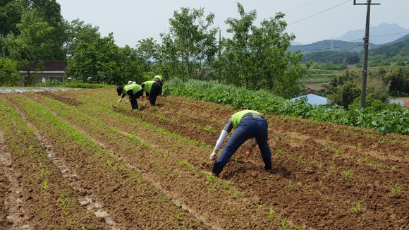 밤새 내린 비로 인하여 작업에 어려움이 있었지만 능숙한 솜씨로 깨 심기 및 제초작업 등 고된 작업을 성실히 수행했다.