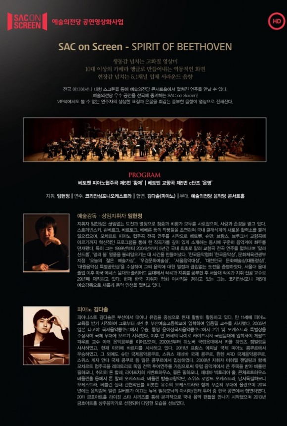 한편, SAC on Screen은 예술의 전당이 ‘땅끝마을 초등학생도 예술의 전당 공연을 볼 수 있게 하자’는 의도로 기획하여 지난 2013년 11월부터 시작한 프로젝트로, 다양한 각도에서 10대 이상의 4k 카메라로 촬영된 초고화질 영상을 생동감 있게 편집하여 아티스트의 표정과 몸짓, 고음질의 음향까지 현장감있게 담아내었다.