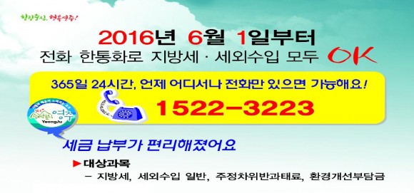|  | | | ⓒ (주)영남도민일보 | | [영남도민일보] 김창기 기자 = 영주시에서는 오는 6월부터 전화 한 통화만 하면 언제, 어디서나 지방세, 세외수입, 주정차위반과태료, 환경개선부담금을 확인하고 바로 납부할 수 있게 된다.