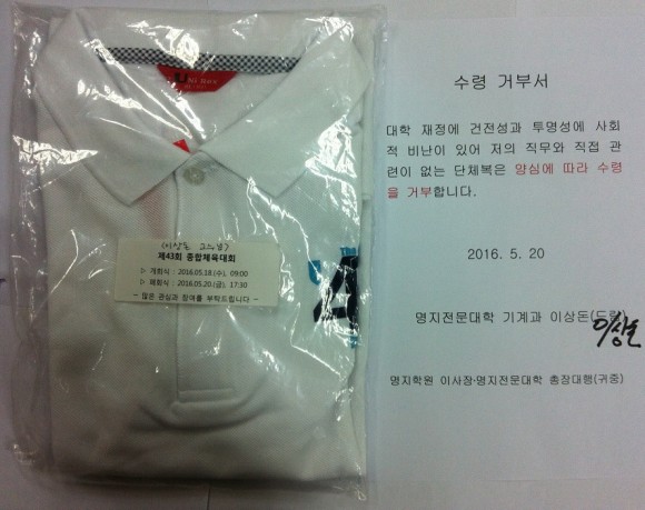 이 교수는 “명지전문대 사태와 관련하여 재정 건전성과 투명성에 대한 사회적 비난이 매우 커 직무와 직접 관련이 없는 제43회 명지전문대 종합체육대회 단체복을 대회 기간 중 양심에 따라 수령 거부했다.”고 6월 2일 밝혔다.
