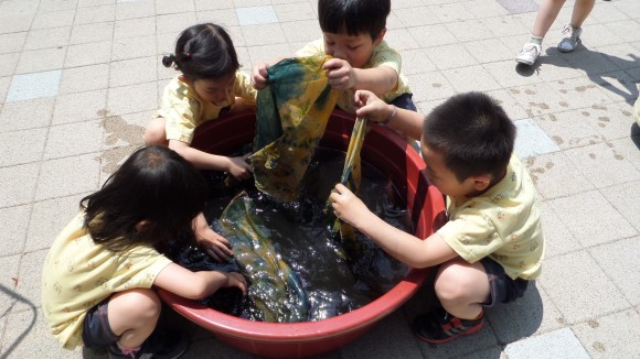 유아들은 유아체험센터 도착 후 체험센터의 다양한 활동과 지켜야 할 약속에 대해 먼저 이야기를 나누고 체험을 시작하였다. 가장 먼저 천연염색체험을 실시했는데, 감으로 주홍빛 물을 들인 인견에 치자의 노란 염색물, 쪽의 푸른 염색물로 무늬를 넣어주었다. 염색체험 후 인견이 햇볕에 마르는 동안 교통놀이 체험장에서 운전체험을, 물놀이장에서 흐르는 땀을 씻으며 물놀이를 했다. 그리고 사육장의 토끼와 닭에게 먹이를 주며 동물과의 친밀감을 돈독히 할 수 있었다.